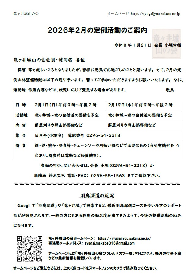 寒さが厳しいころとなりましたが、皆さまいかがお過ごしでしょうか。 竜ヶ井城山の会 2月の定例山林整備活動は、1日(日)と19日(木)に行います。 予定としては、竜ヶ井城から竜の台付近での整備を行う予定です。皆さま奮ってご参加ください。なお、活動地・作業内容は、状況に応じて変更する場合があります。