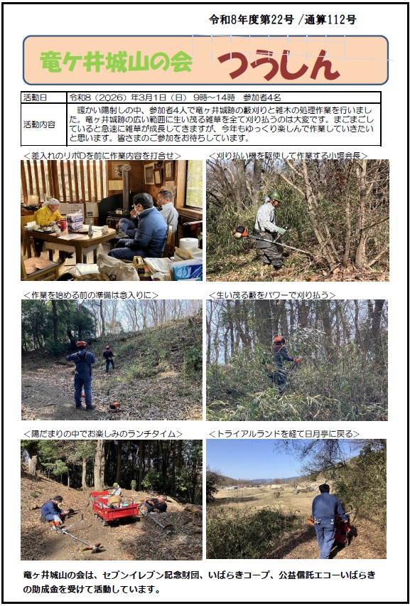 「竜ヶ井城山の会つうしん」第112号を発行しました。暖かい陽射しの中、参加者4人で竜ヶ井城跡の藪刈りと雑木の処理作業を行いました。竜ヶ井城跡の広い範囲に生い茂る雑草を全て刈り払うのは大変です。まごまごしていると急速に雑草が成長してきますが、今年もゆっくり楽しんで作業していきたいと思います。皆さまのご参加をお待ちしています。 印刷用の pdf はこちらです。